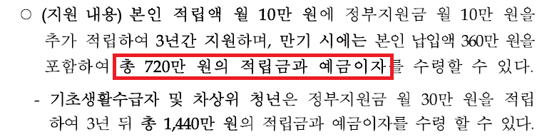 - 3년 만기 시 720만 원 + 예금이자 수령 : 3년 만기 시 본인이 납입한 360만 원의 원금에다가, 정부 지원금 360만 원을 더한 720만 원에 예금이자를 합하여 수령할 수 있으며, 기초수급자나 차상위계층이라면, 360만 원에 정부지원금 1,080만을 더한 1,440 만 원에 예금이자를 합하여 수령할 수 있습니다.