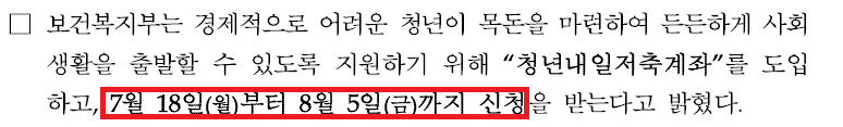 - 7월 18일 ~ 8월 5일 : 청년내일저축계좌는, 위와 같이 7월 18일부터, 8월 5일까지 신청을 받습니다.