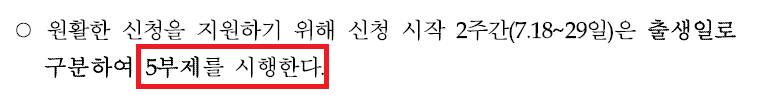 - 신청 5부제 : 신청 초기, 서버 혼잡과 혼란을 피하기 위해, 신청 2주간(7월 18일 ~ 7월 29)은 출생일로 구분하여 신청 5부제를 시행합니다.