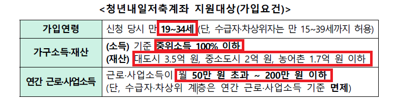 - 만 19세 ~ 34세 : 청년내일저축계좌는 대한민국이 정하는 청년의 나이에 부합해야 신청이 가능합니다. 대한민국에서 청년은 만 19세 이상에서, 만 34세 이하로 규정하고 있습니다. 만일 기초수급자나 차상위계층이라면, 만 15세 이상, 만 39세 이하로 기준이 완화됩니다.