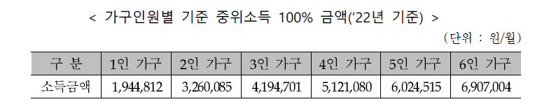 - 중위소득 100% 이하 : 청년내일저축계좌는 위와 같이 청년이 속한 가구 구성원에 따라 소득금액이 중위소득 100% 이하에 속해야 신청할 수 있습니다.